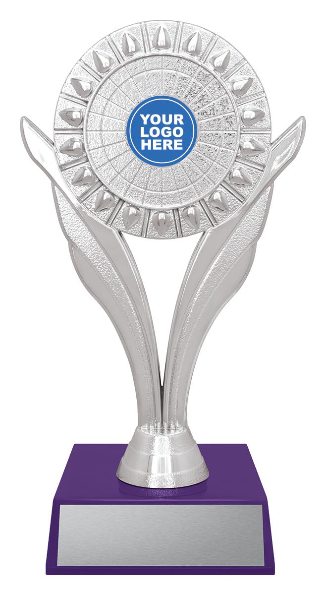 This silver and purple dance trophy combines contemporary design with enduring quality. Featuring a circular top framed by elegant, leaf like silver supports, it offers a refined way to celebrate achievement in dance. The central area accommodates a 25mm logo or emblem, while the vibrant coloured base enhance its professional appeal, making it a standout among dance trophies.