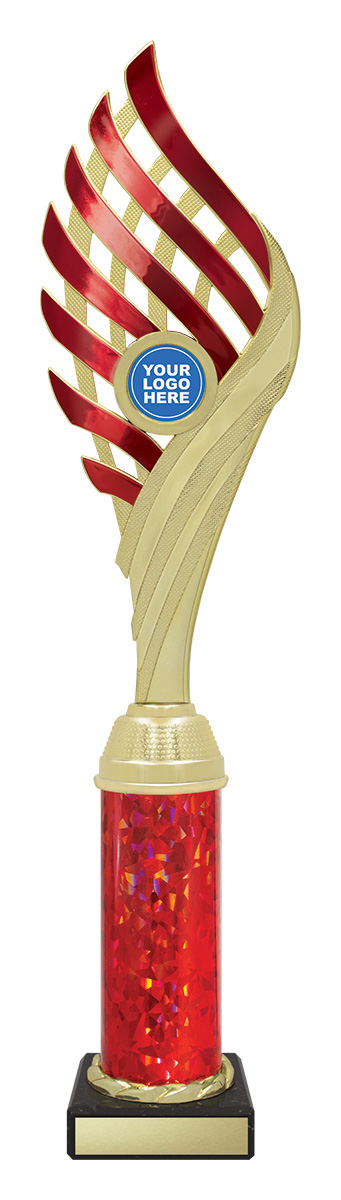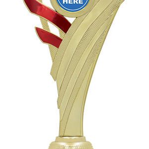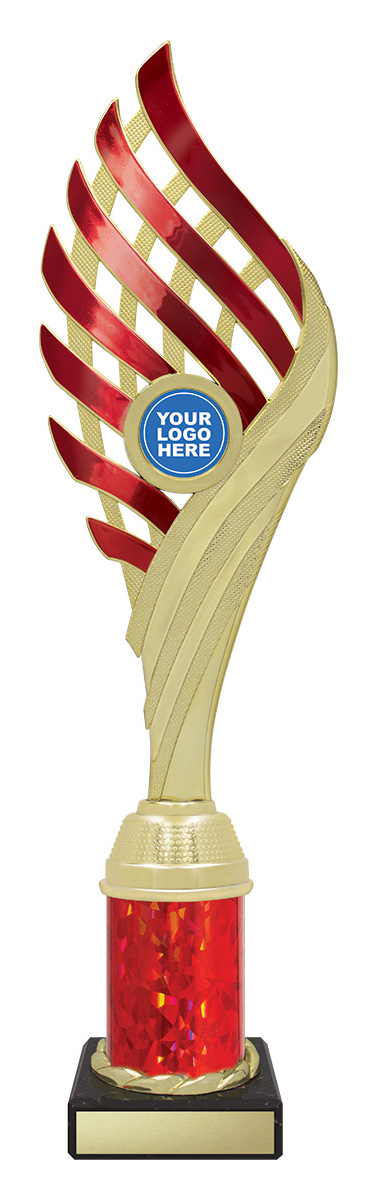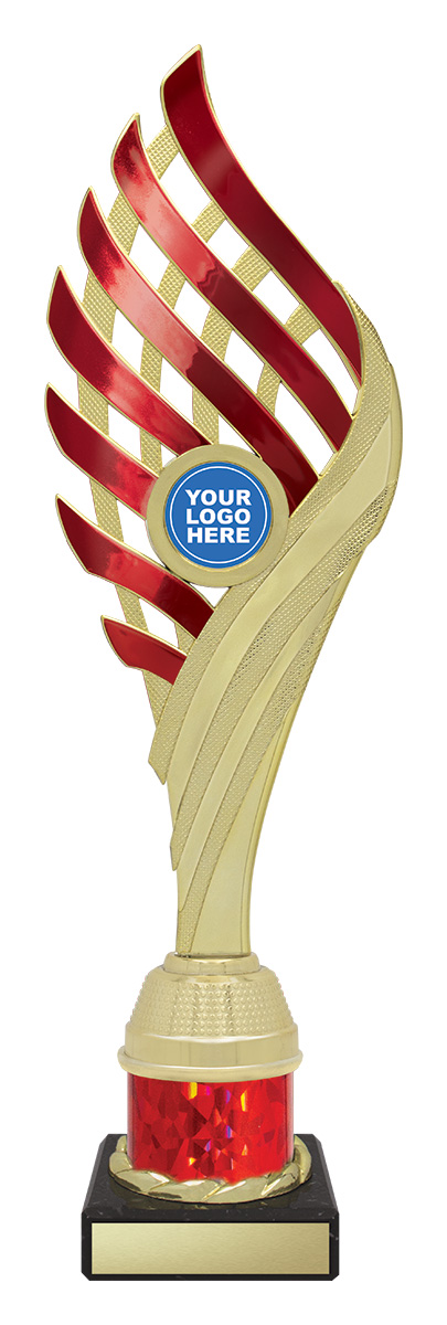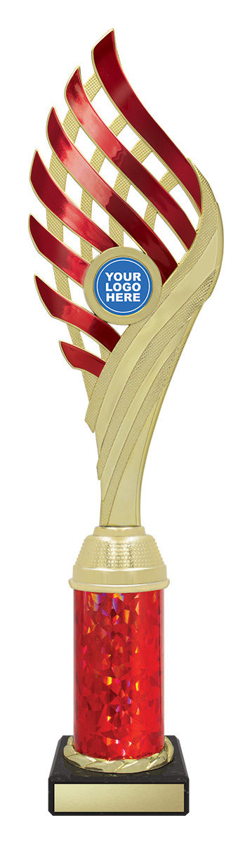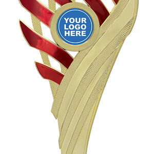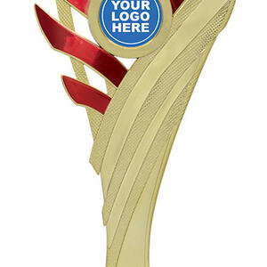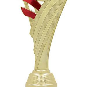 This dance trophy from the Skyway Series combines a distinctive curved silhouette with vibrant gold and red tones for a memorable presentation. Crafted from a metallic finish material, it features a cylindrical base and is set on a sleek black plinth, making it a fitting symbol of achievement in dance.