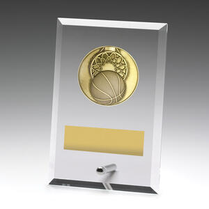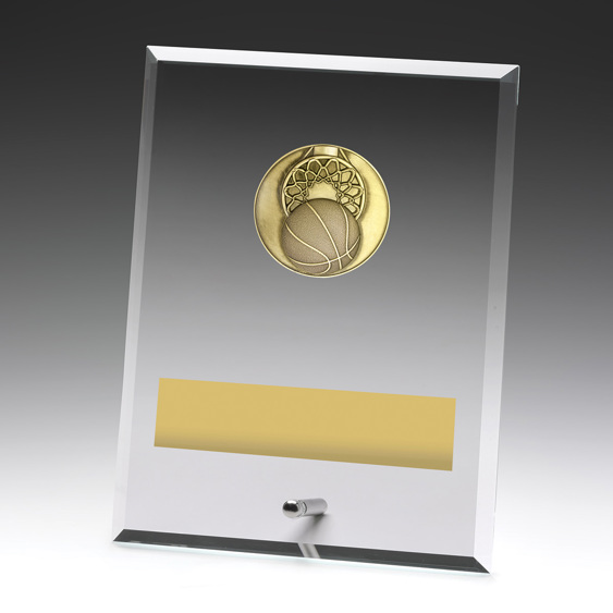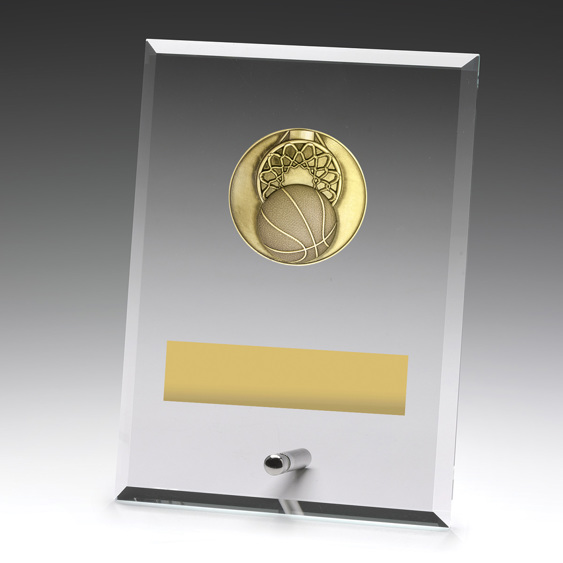 This modern glass plaque combines elegance and sport with a gold basketball medallion set into a clear beveled glass panel. Supported by a chrome stand, it offers a sophisticated way to acknowledge top players or special achievements. Includes gold engraving plate for your wording.