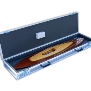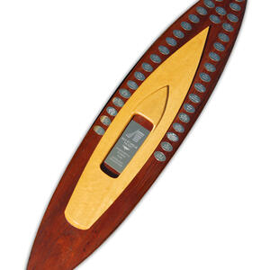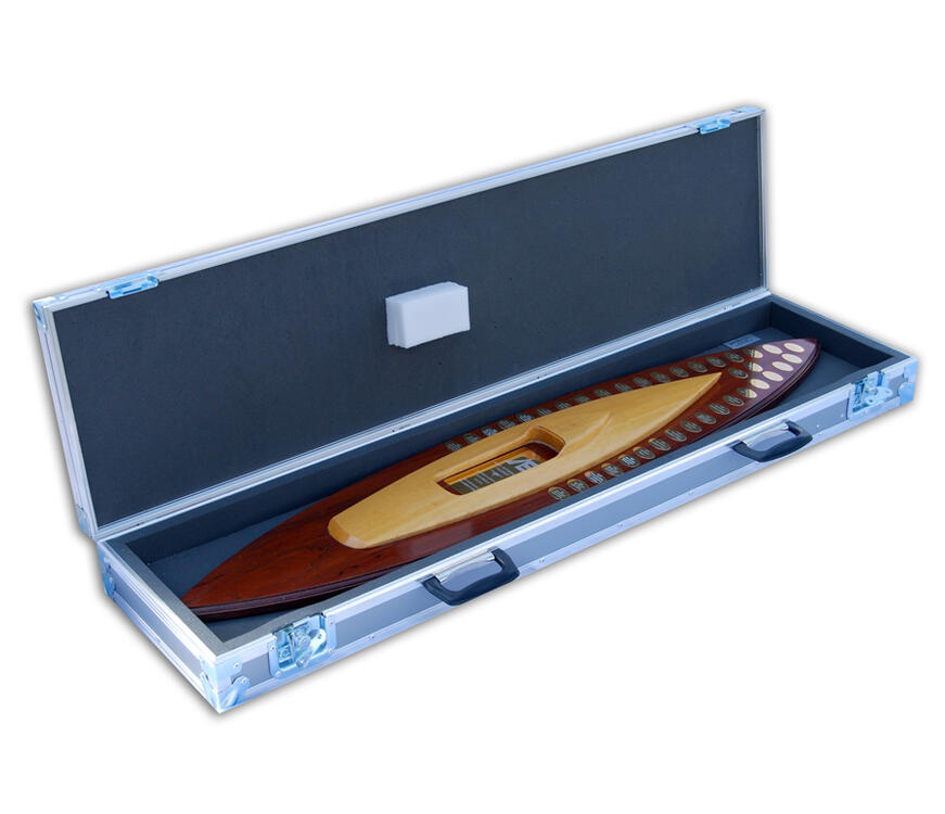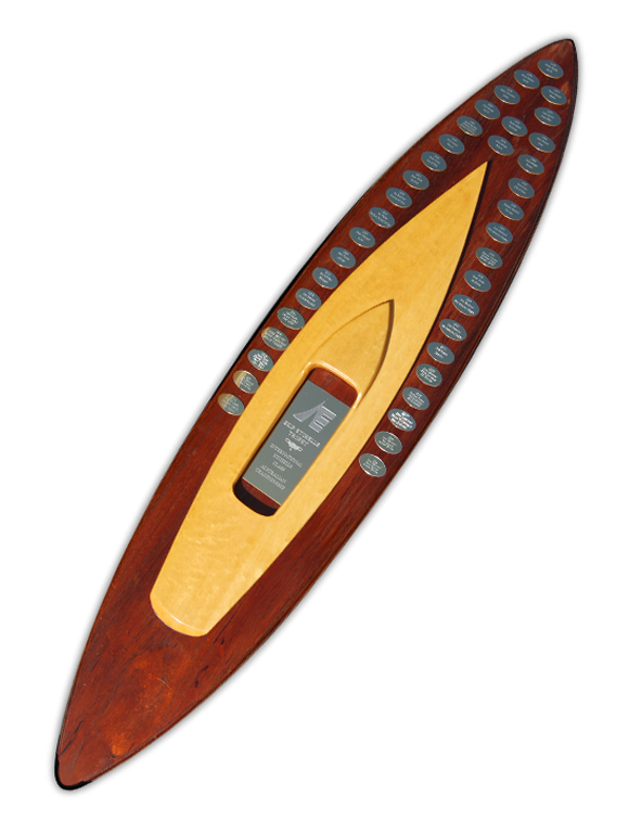 This handcrafted timber perpetual trophy features a distinctive layered yacht inspired design, combining warm natural tones with precision craftsmanship.