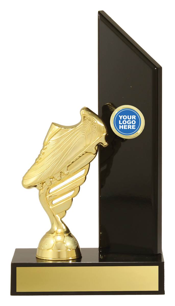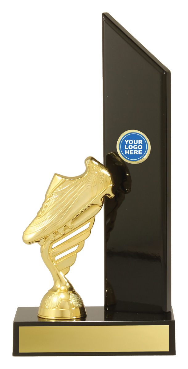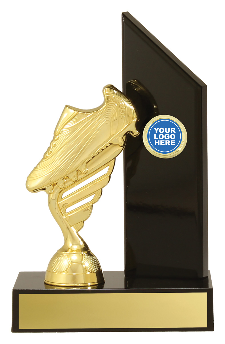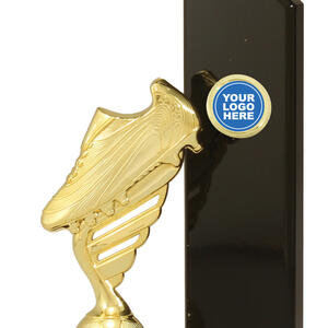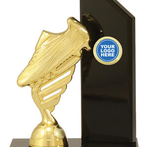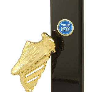 Celebrate football excellence with this golden boot trophy, crafted to honour remarkable achievement. The design features a polished gold football boot set against a sleek, wing inspired structure on a durable black and gold base. With a space for a custom emblem, this award delivers a distinguished and professional recognition.