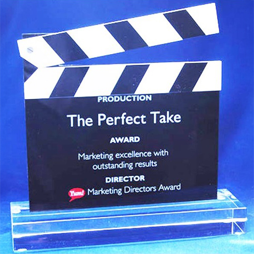 This contemporary acrylic trophy captures the essence of the clapper board, standing at 230mm high for a striking presence. With clean lines and a polished surface, it is designed to celebrate achievement in film, media, and the creative arts.
