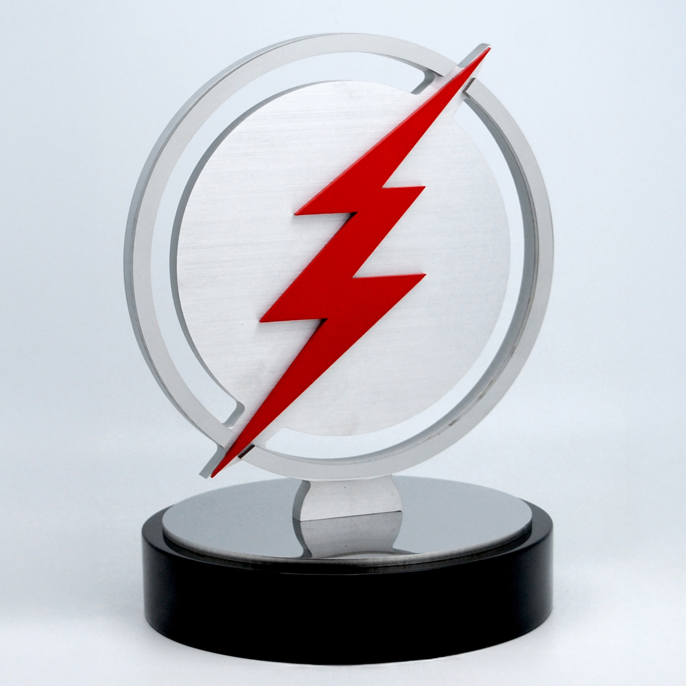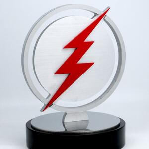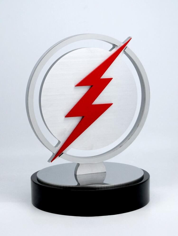 The bold red lightning bolt overlays a brushed metal circular form, creating a sense of speed and energy.