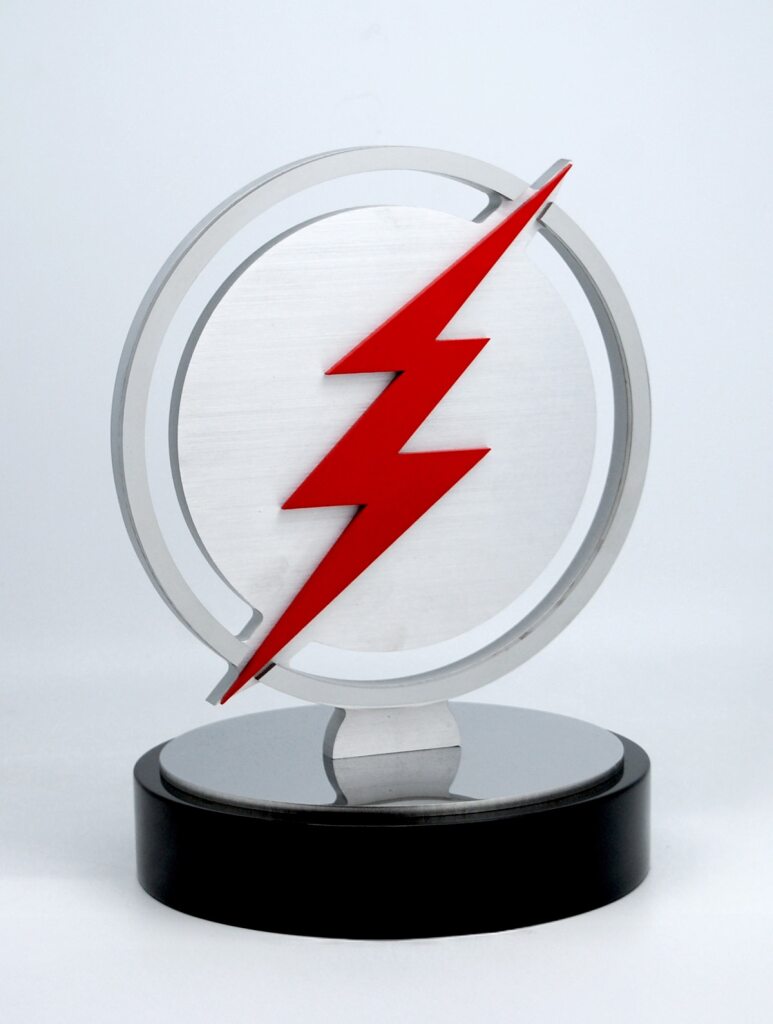 This contemporary custom award combines precisionccut metal layers with striking colour detail.