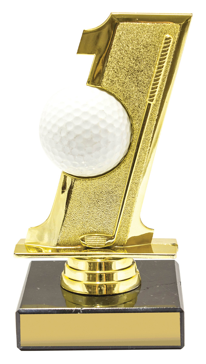 Celebrate a remarkable golfing milestone with this distinguished hole-in-one trophy. Crafted from a blend of plastic and marble, it features an elegant gold and black colour palette. The trophy's number one design is accentuated by a raised golf ball and golf club motif, creating a memorable and professional tribute to individual achievement on the course.