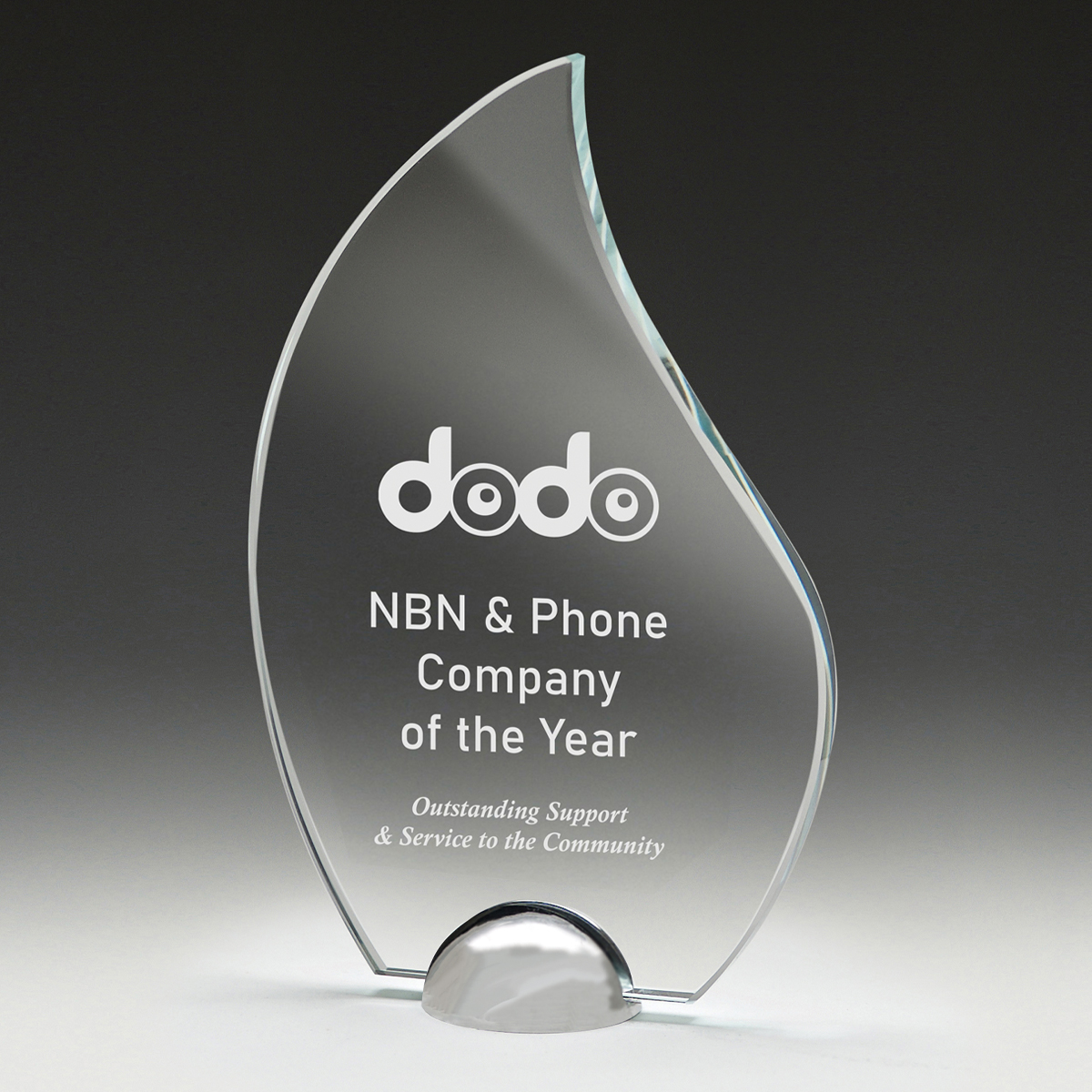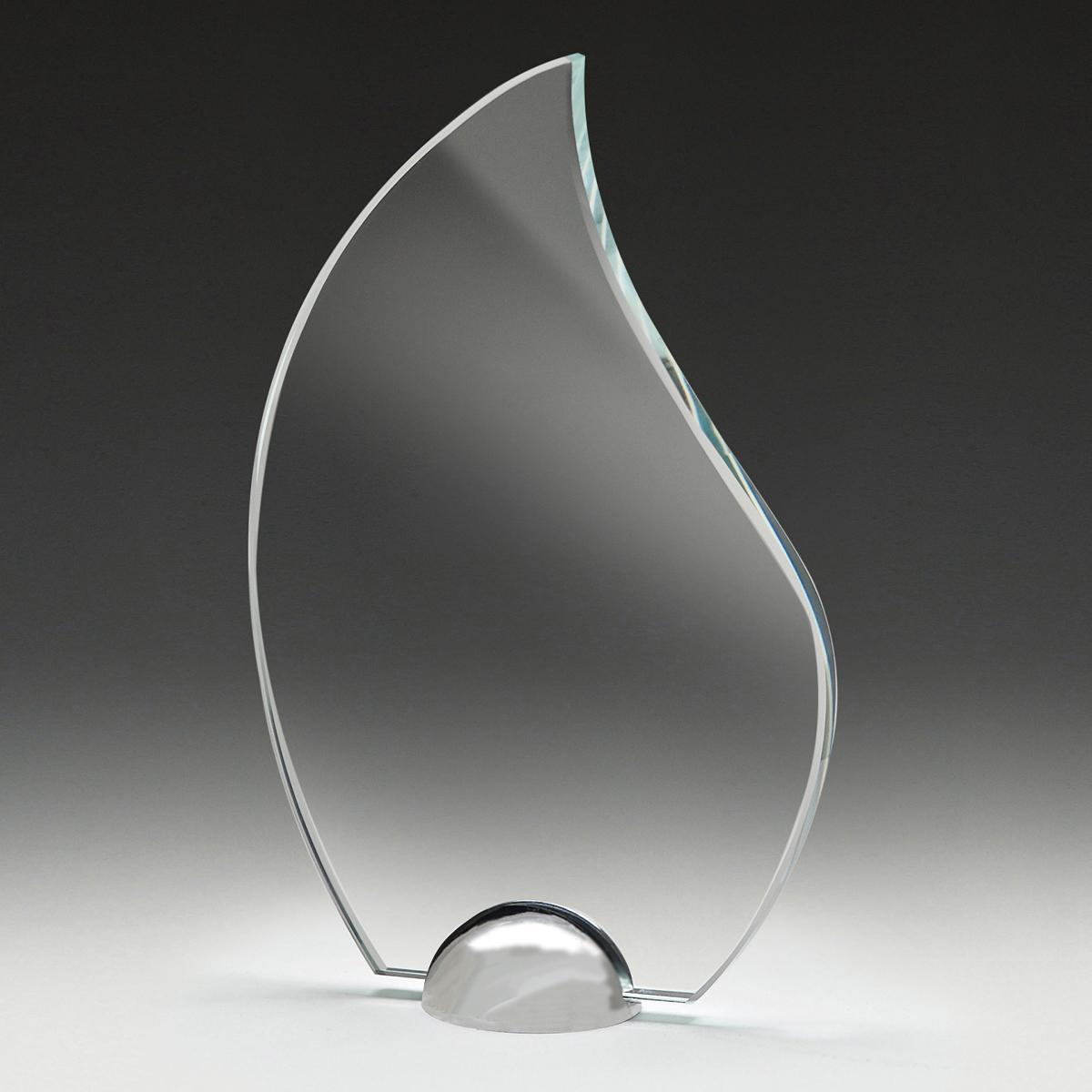 Glass trophies typically have a very slight green tinge, which can subtly affect the appearance of colour printing. In contrast, crystal trophies are completely clear.