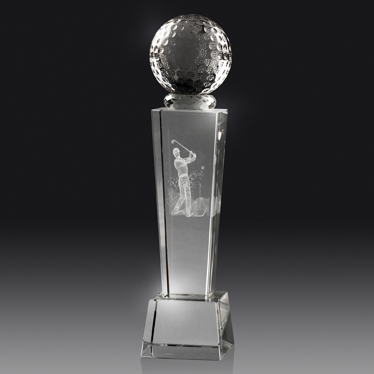 This crystal golf trophy stands out with its crystal clear construction and striking, spherical top. At its heart, a detailed golfer figure is etched within the glass, capturing the spirit and motion of the game. Crafted for lasting impact, this elegant award is a fitting tribute to achievement at golf tournaments and special recognition events.