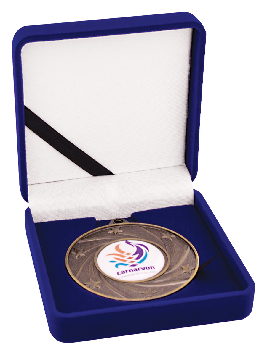 This medal presentation box offers a refined way to celebrate achievement in any sporting context. Crafted from deep blue velvet, the rectangular case protects and displays a circular metal medal, all set against a plush, velvet lined interior, creating a memorable and professional presentation. Fits 50mm Medal