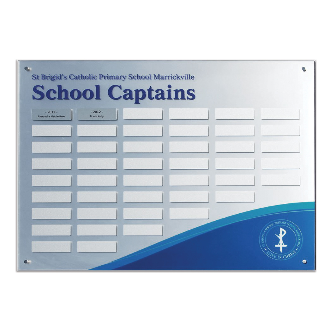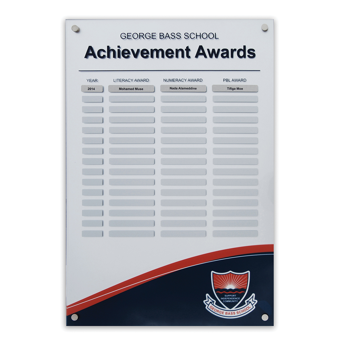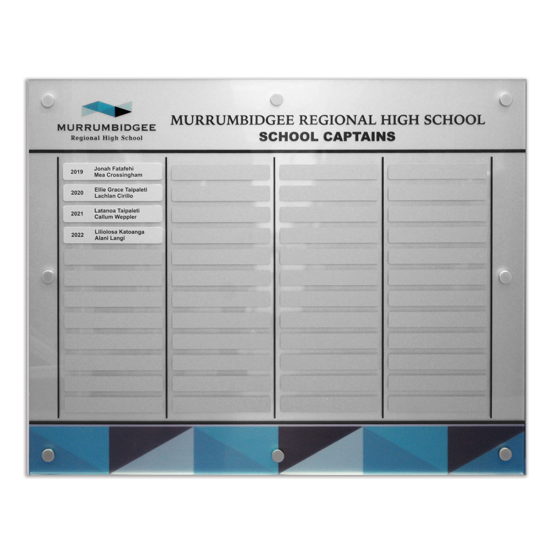Our contemporary honour boards are made from acrylic, metal, glass, or a combination.