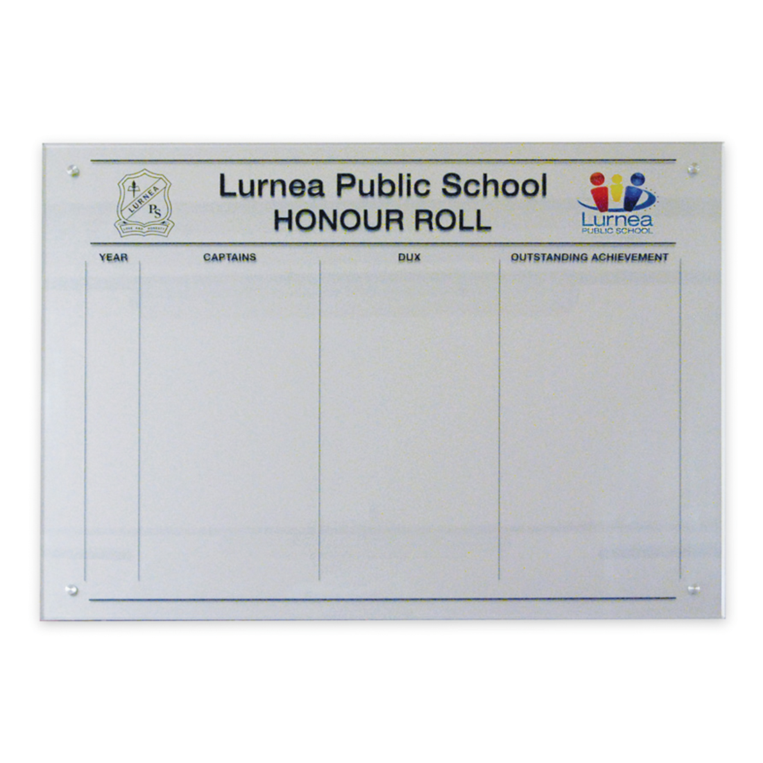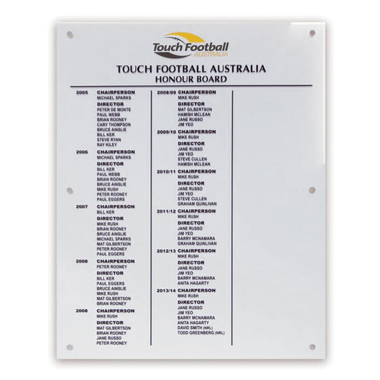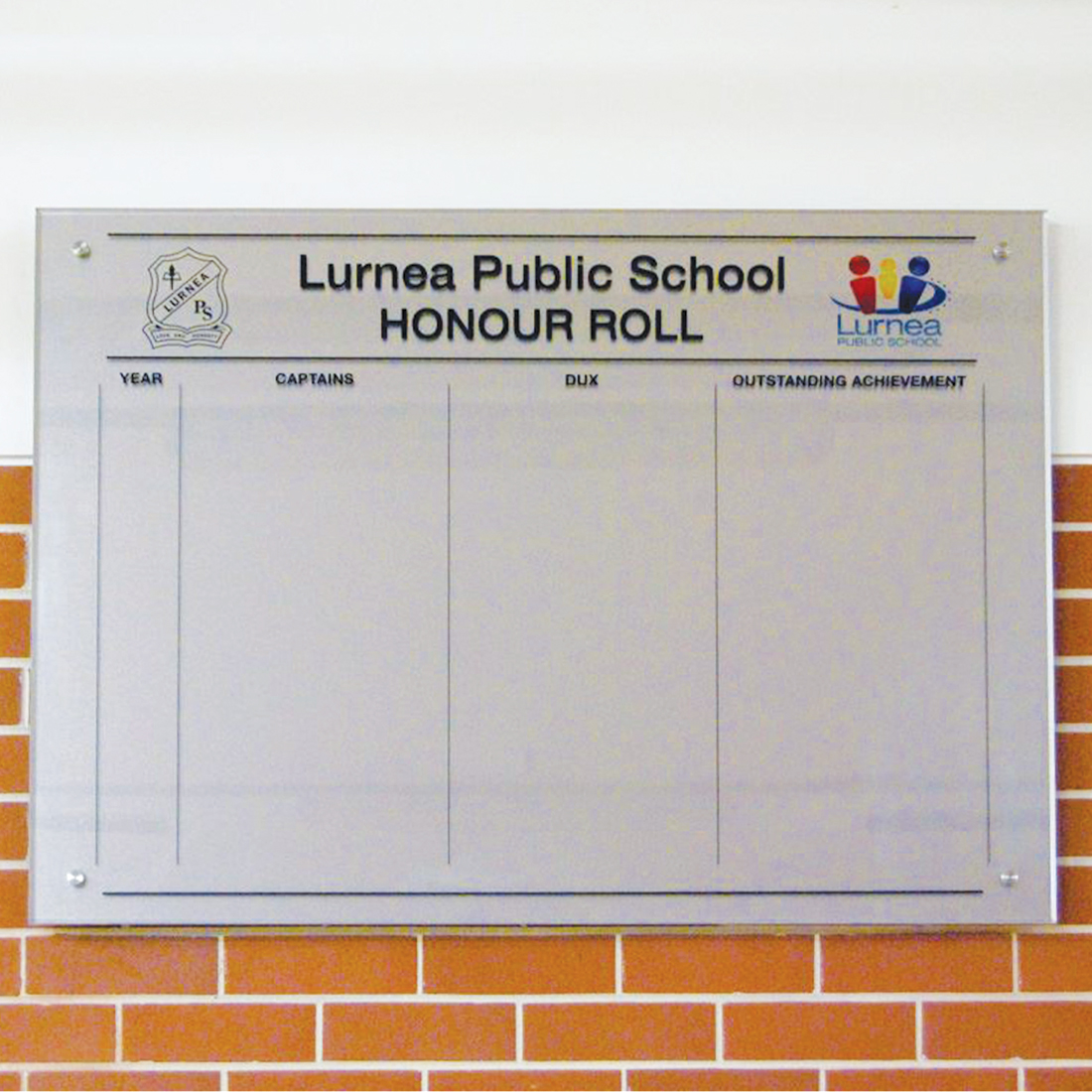 Our contemporary honour boards are made from acrylic, metal, glass, or a combination.
