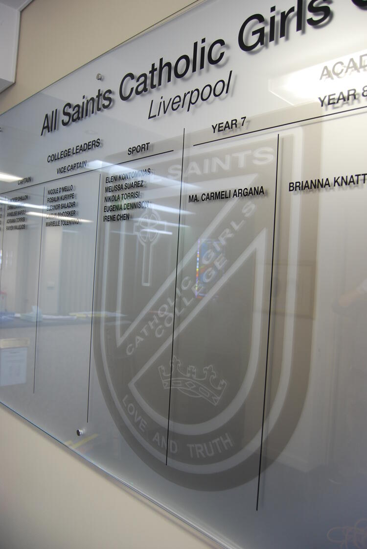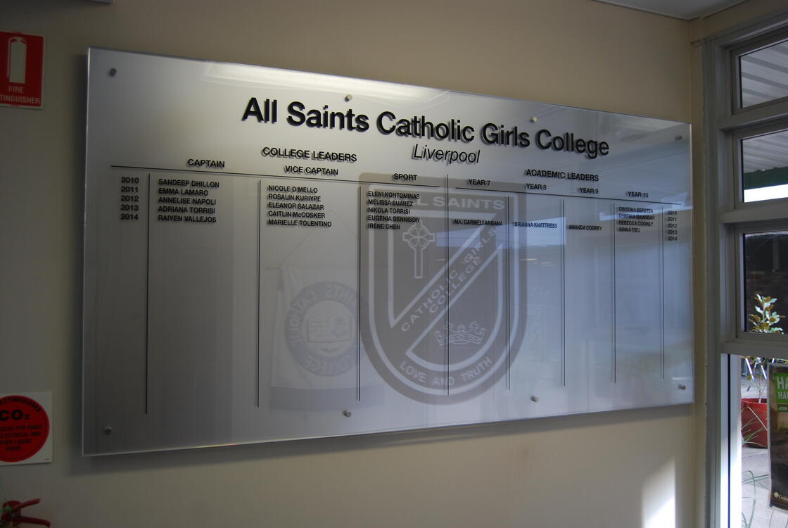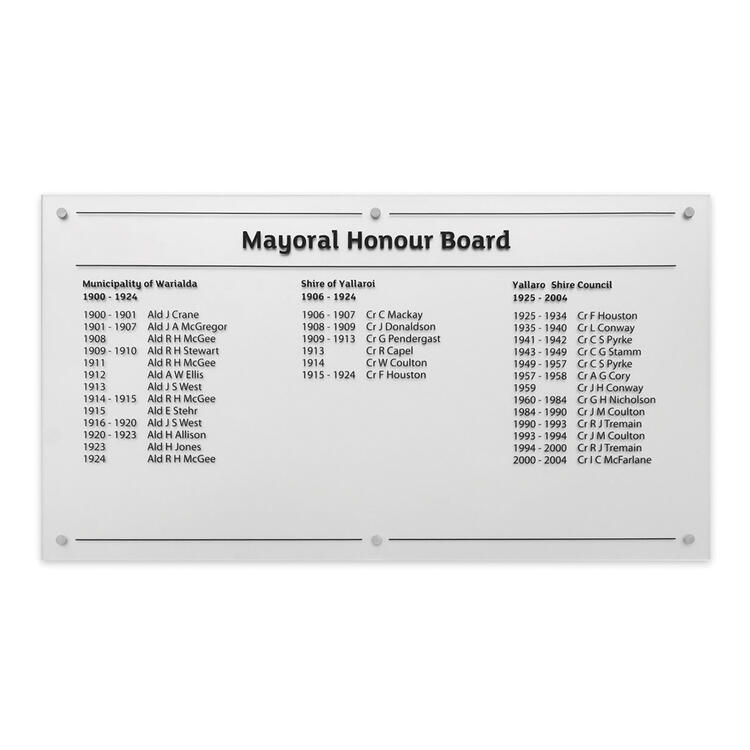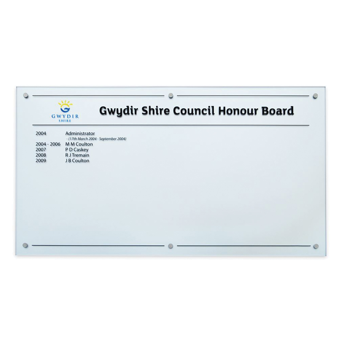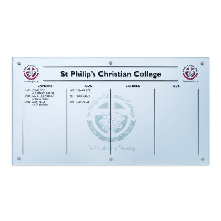 This contemporary honour board is crafted from premium Starfire glass and finished with precise vinyl lettering, delivering an elegant and enduring platform for recognition.