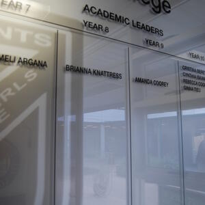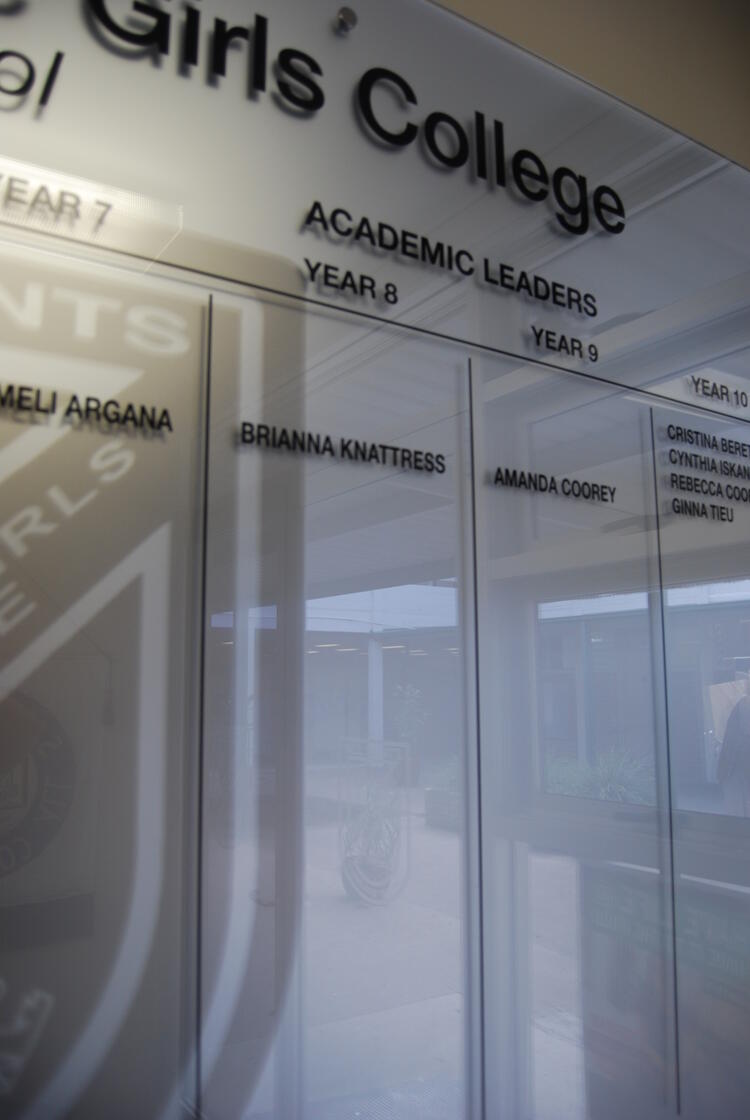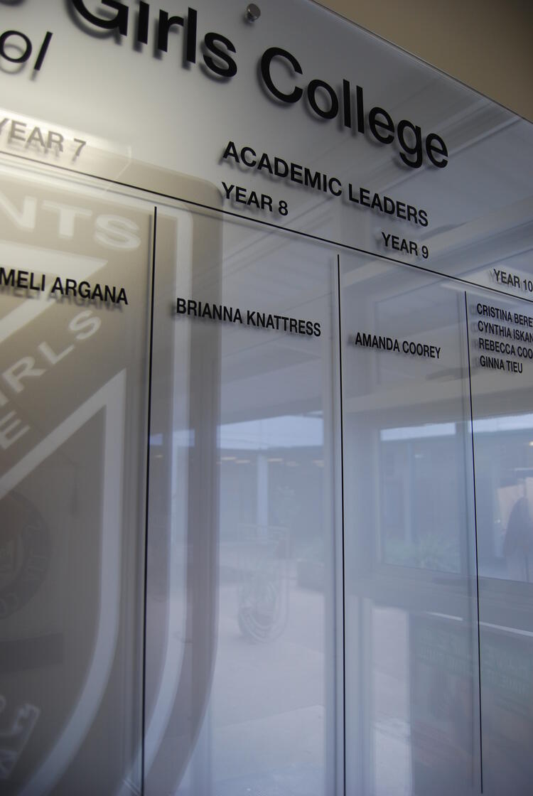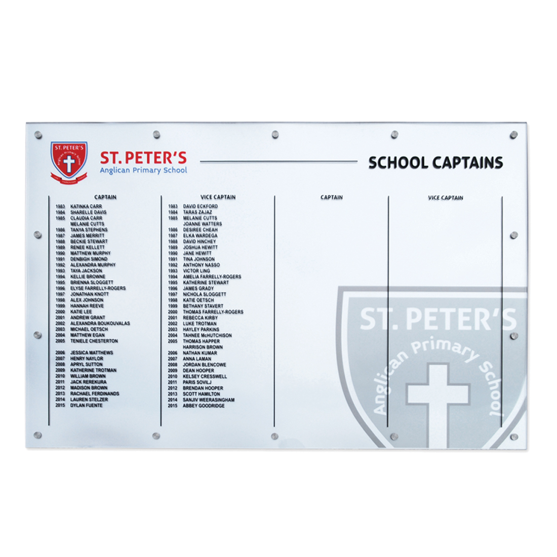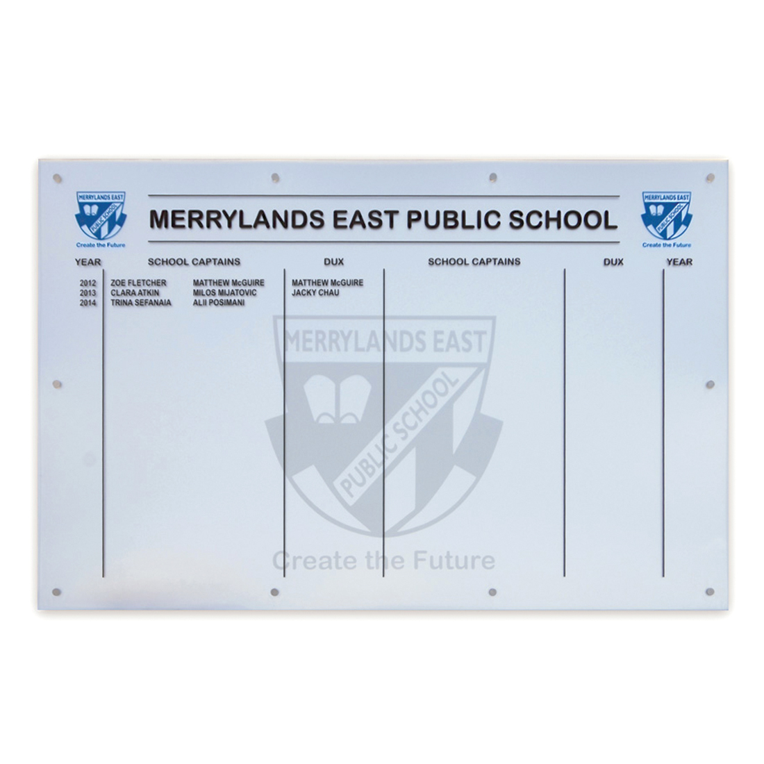This contemporary honour board is crafted from premium Starfire glass and finished with precise vinyl lettering, delivering an elegant and enduring platform for recognition.