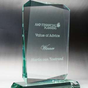 Glass trophies typically have a very slight green tinge, which can subtly affect the appearance of colour printing. In contrast, crystal trophies are completely clear.