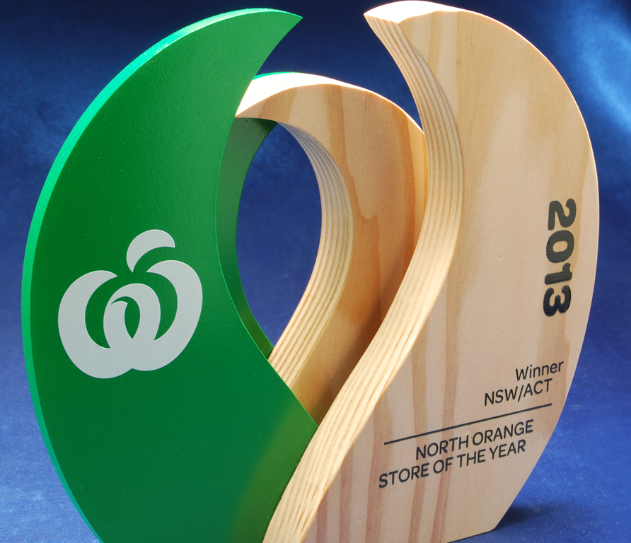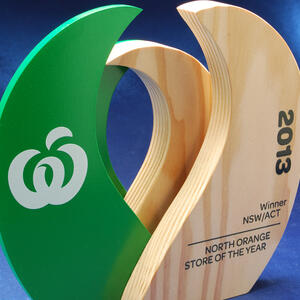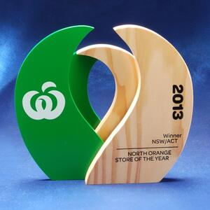 This modern timber award features a bold sculptural shape with one half finished in natural timber and the other in Woolworths signature green. Precision colour printing highlights the logo and award details.