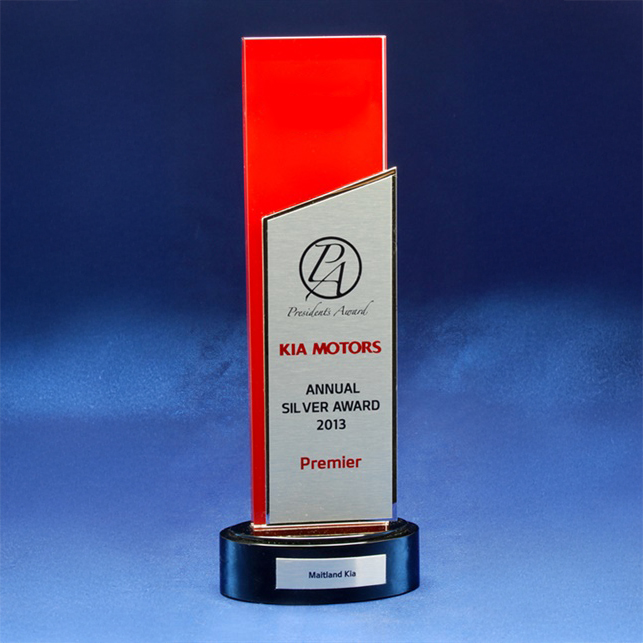 This contemporary layered design delivers a strong corporate aesthetic suited to performance, dealership, or leadership awards.