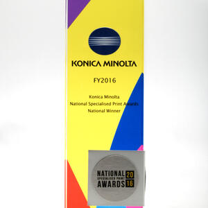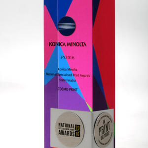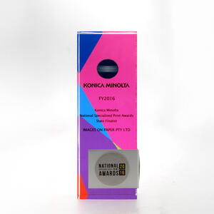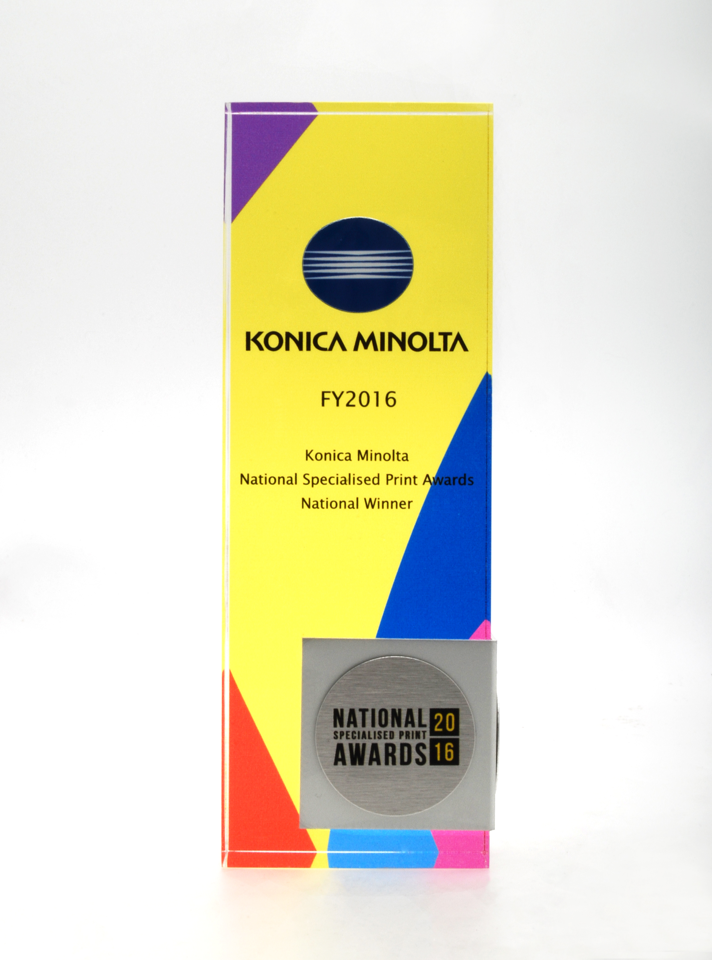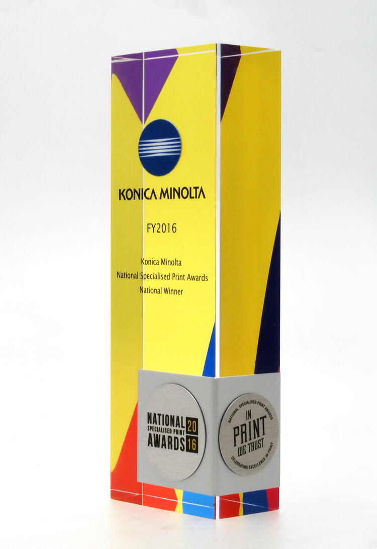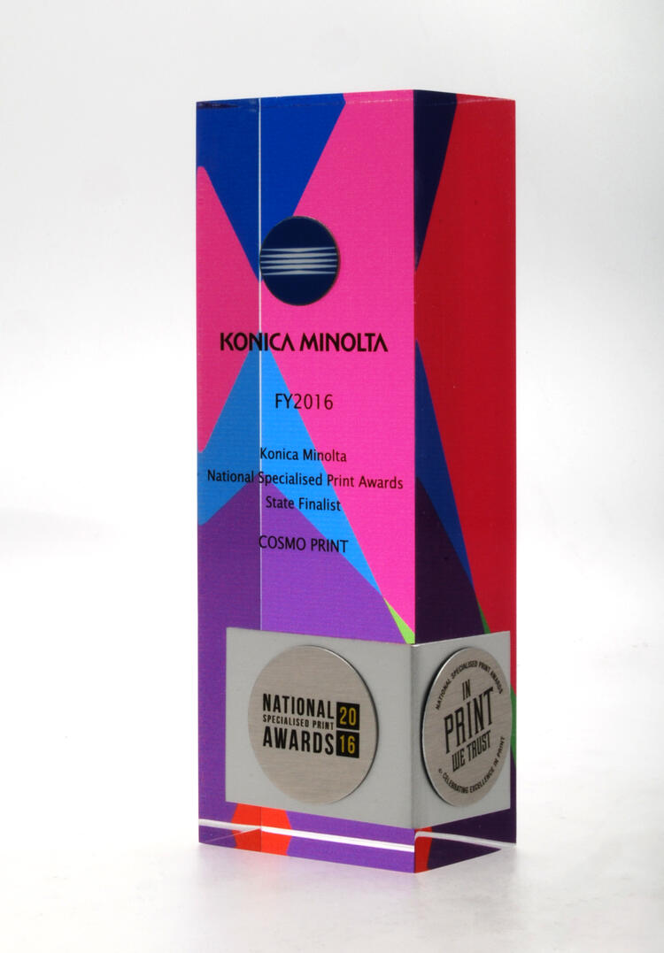 A modern fusion of materials, this acrylic award features a vibrant UV printed background with layered colour elements encapsulated within the clear acrylic block. A custom bent brushed metal wraparound accent on the front adds depth, sophistication, and a striking contrast to the design.