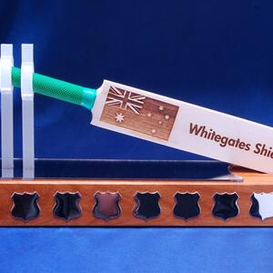 A creative perpetual trophy featuring a miniature timber cricket bat with laser engraving, mounted on a clear acrylic stand and solid timber base.