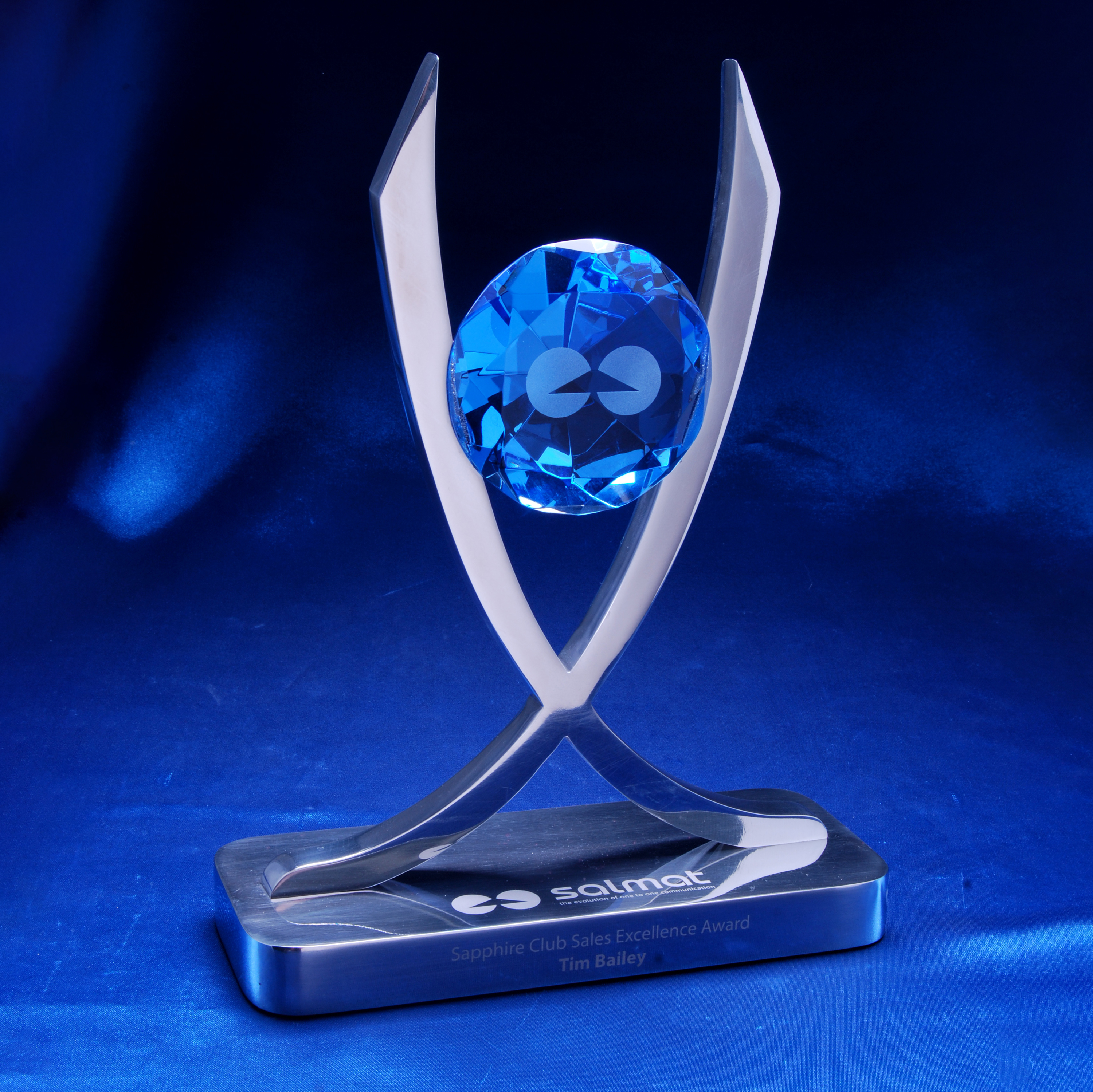 Crafted from polished alloy, the sleek twin column design rises gracefully to cradle a striking blue crystal diamond, symbolising clarity, prestige, and success.