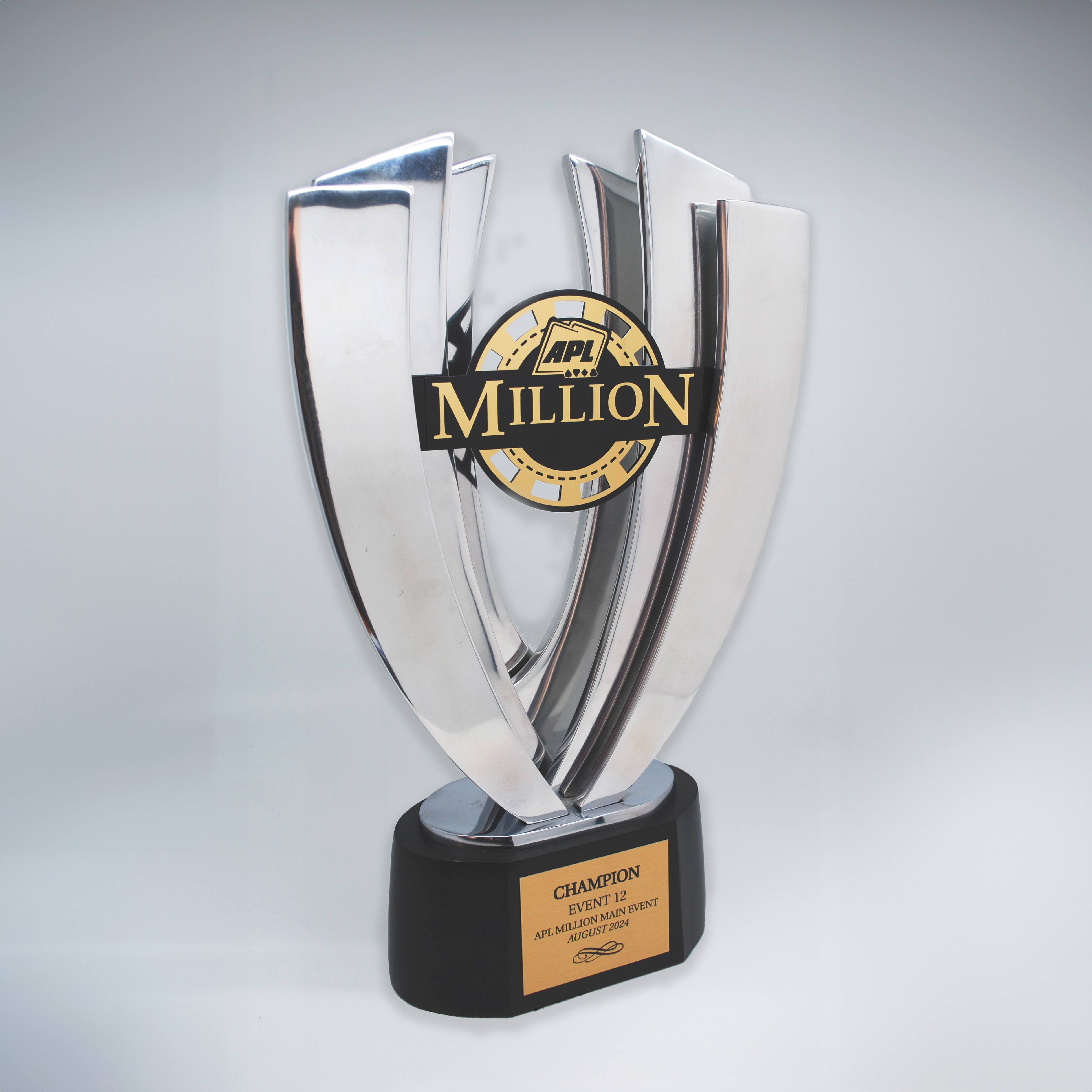 Crafted from premium metal with a mirror finish, the design captures light and movement beautifully. Mounted on a solid black base with an engraved plaque, it exudes prestige and quality.