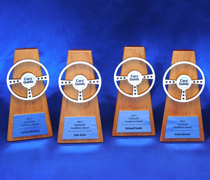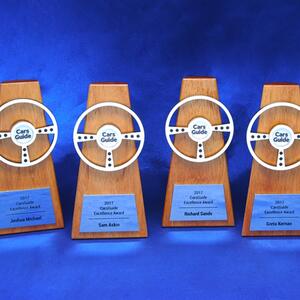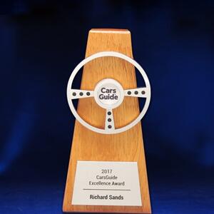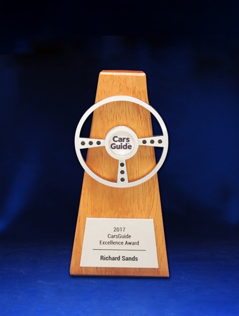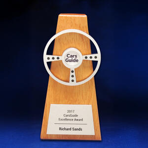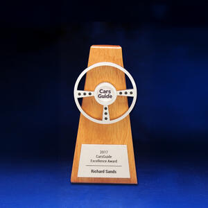 A sleek metal and timber award featuring a precision cut alloy steering wheel mounted to a natural timber base.