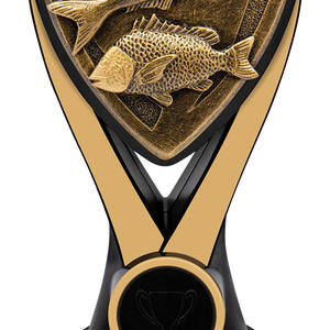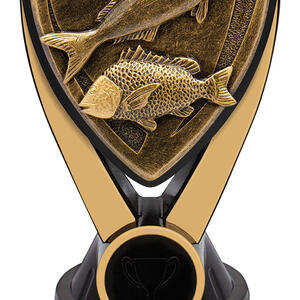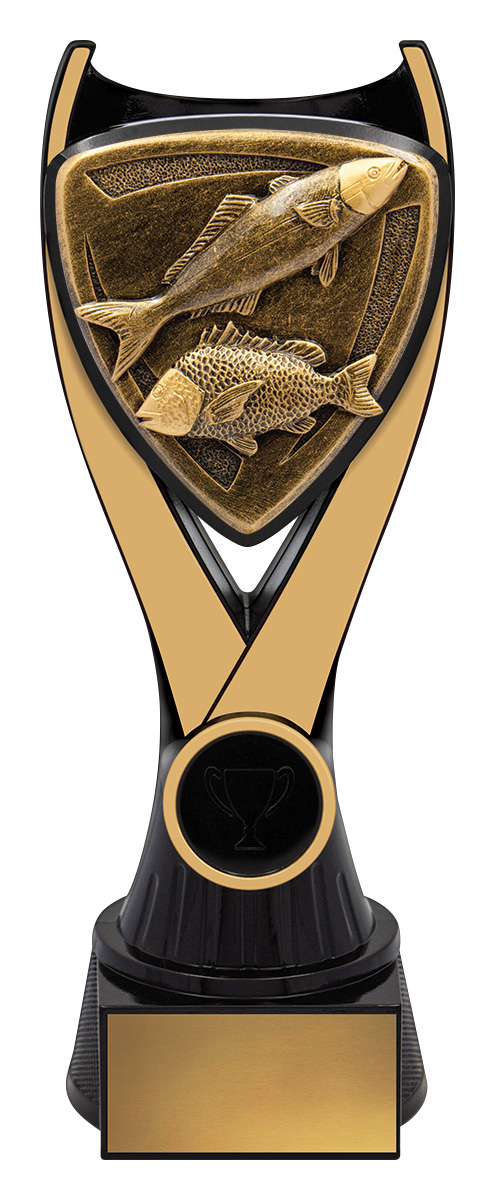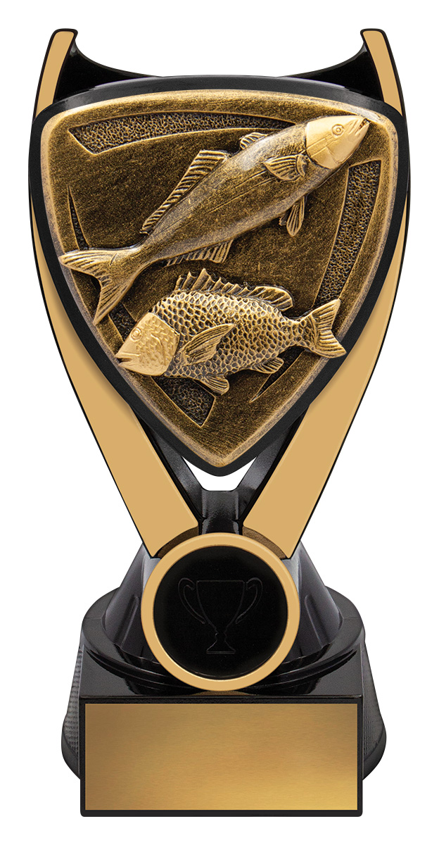 Celebrate angling success with this striking fishing trophy, crafted in a sophisticated gold and black palette. The shield like form is accented by detailed embossed fish designs, reflecting both quality and sport-specific artistry. Durable resin construction ensures this award stands as a memorable symbol of fishing achievement.