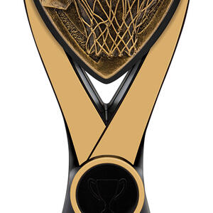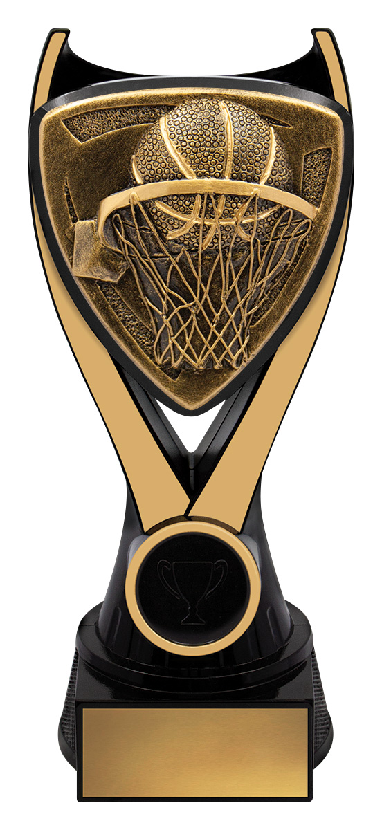 This dynamic trophy celebrates basketball achievement with a striking gold and black finish. Designed with a basketball and hoop motif, it stands as a testament to sporting effort and team spirit. Crafted from durable resin, this piece fits seamlessly within basketball trophies collections and features a base suitable for engraving.