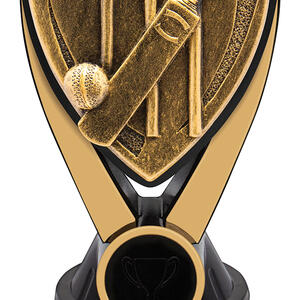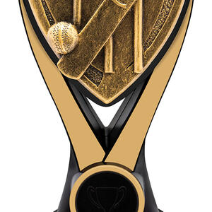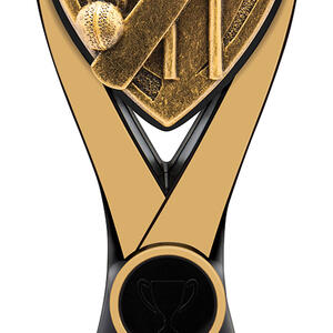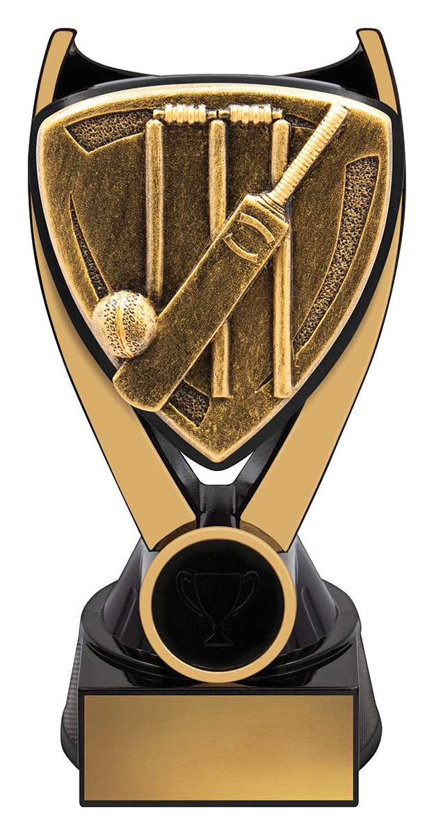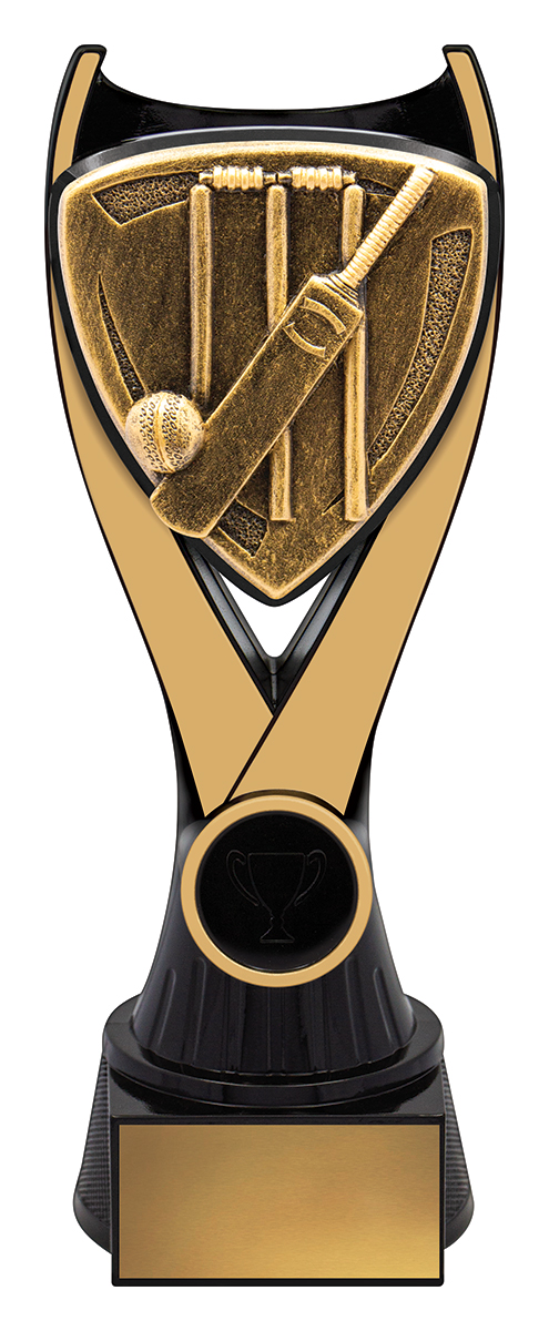 This expertly crafted cricket trophy features a striking shield like silhouette in sophisticated gold and black. The design showcases a cricket bat, ball, and stumps, making it an ideal choice for celebrating skill and achievement in cricket. A resin construction ensures this award stands out among cricket trophies for both its quality and memorable presence.