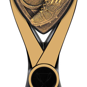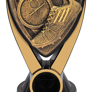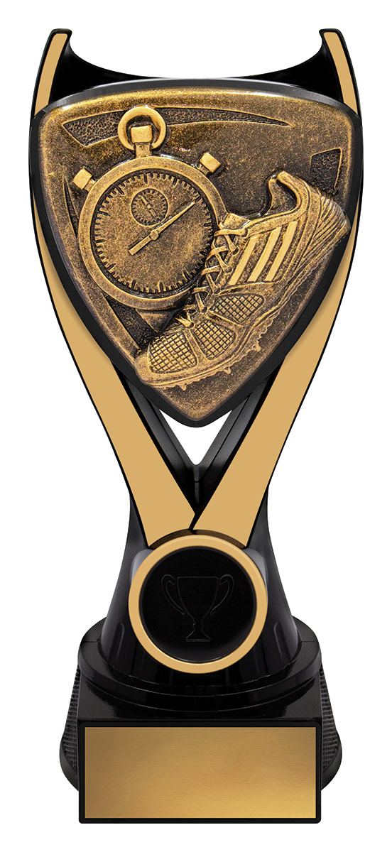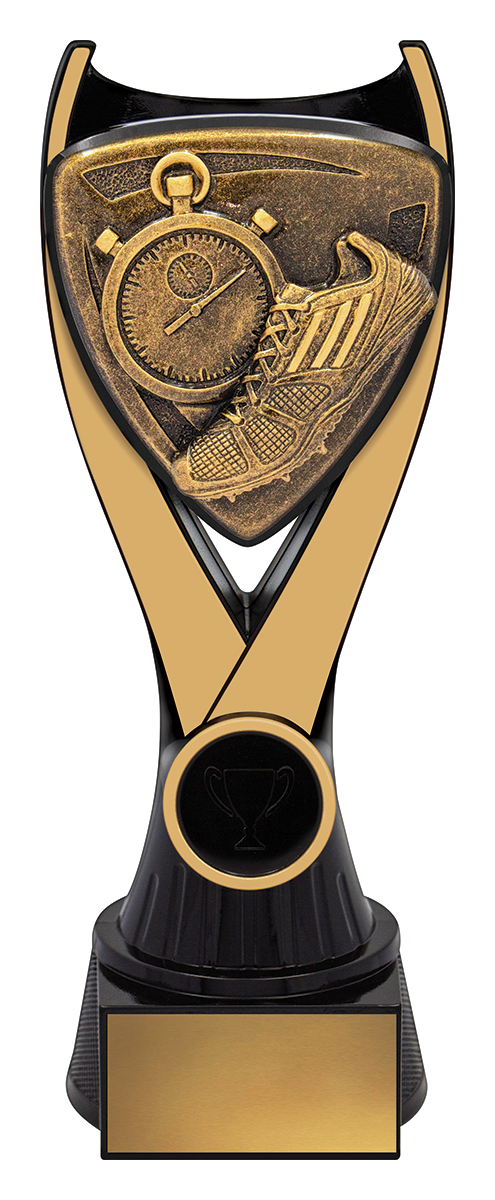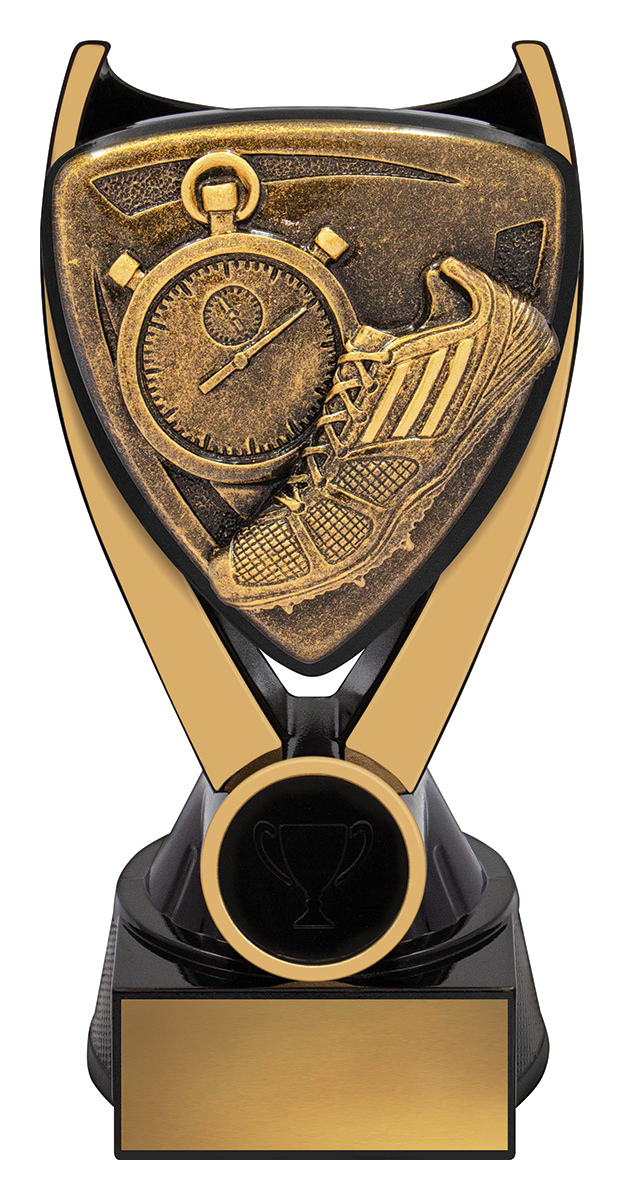 This athletics trophy features a striking gold and black design, crafted from a blend of resin and plastic for durability and visual impact. The triangular upper section showcases a detailed stopwatch and running shoe, symbols of speed and determination in athletic achievement. Its modern silhouette and precise detailing make it a memorable award for recognising performance in athletics.