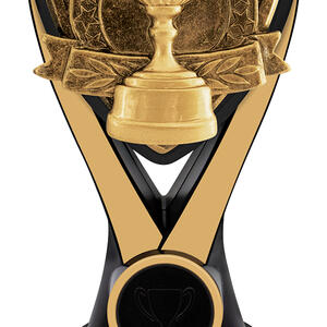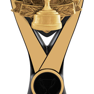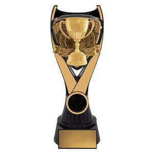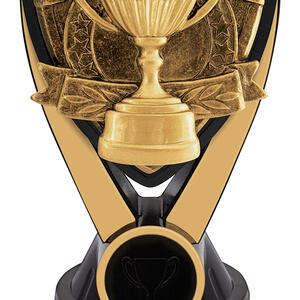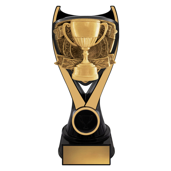 This Cup Achievement Trophy features a gold cup design framed within a bold black and gold structure. Ideal for recognising top performers across any sport or competition. Crafted from resin with a glossy finish and supplied with an engraving plate.