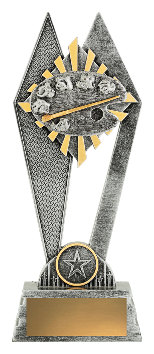 Celebrate creative achievement with this art award trophy, thoughtfully crafted for art and design recognition. Featuring an elegant combination of silver and gold, this trophy showcases a distinctive paint palette and brush motif set on a triangular base, finished with a star emblem. Durable resin construction make it a trusted choice for memorable art focused ceremonies.