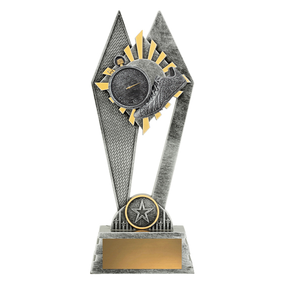 This track trophy features a striking geometric design with a stopwatch and running shoe motif, capturing the spirit of athletics and competitive achievement. Crafted from resin, it is available in a silver and gold finish for a refined, durable finish. The rectangular base is accented with a star emblem, creating a memorable award for standout performances.