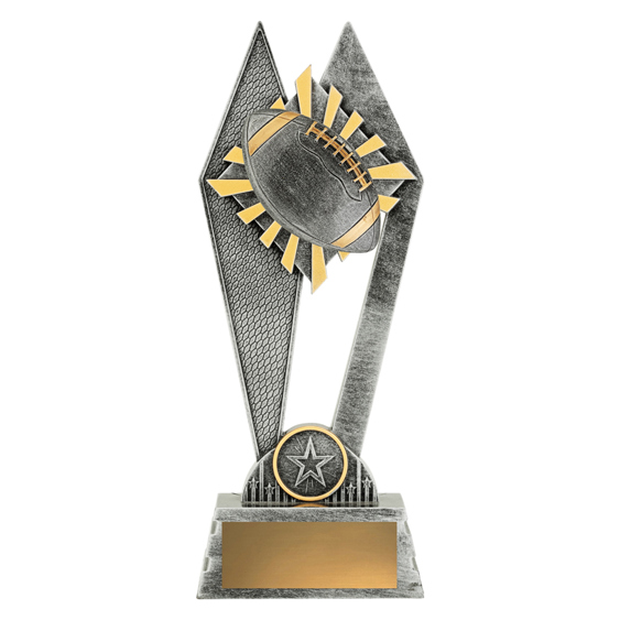 This american football trophy features a dynamic football design accented by a shining star emblem, symbolising standout achievement on the field. Crafted from durable resin in a sophisticated silver and gold finish, it offers a refined presentation. The sturdy base is designed for additional customisation, making it a memorable award for clubs, schools, and sporting events.