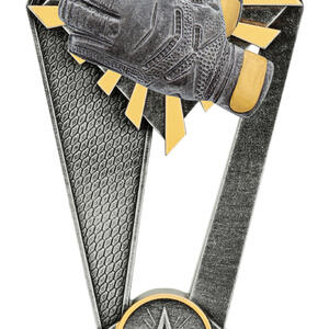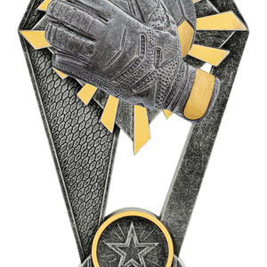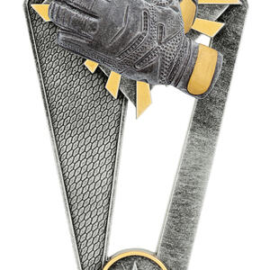 This goalkeeper trophy stands out with a bold silver and gold finish, crafted from durable resin for a lasting impression. Its triangular base supports a dynamic central motif featuring a goalkeeper's glove and soccer ball, accented by a star emblem. Perfect for soccer trophies collections, it offers a distinguished way to celebrate achievement on the field.