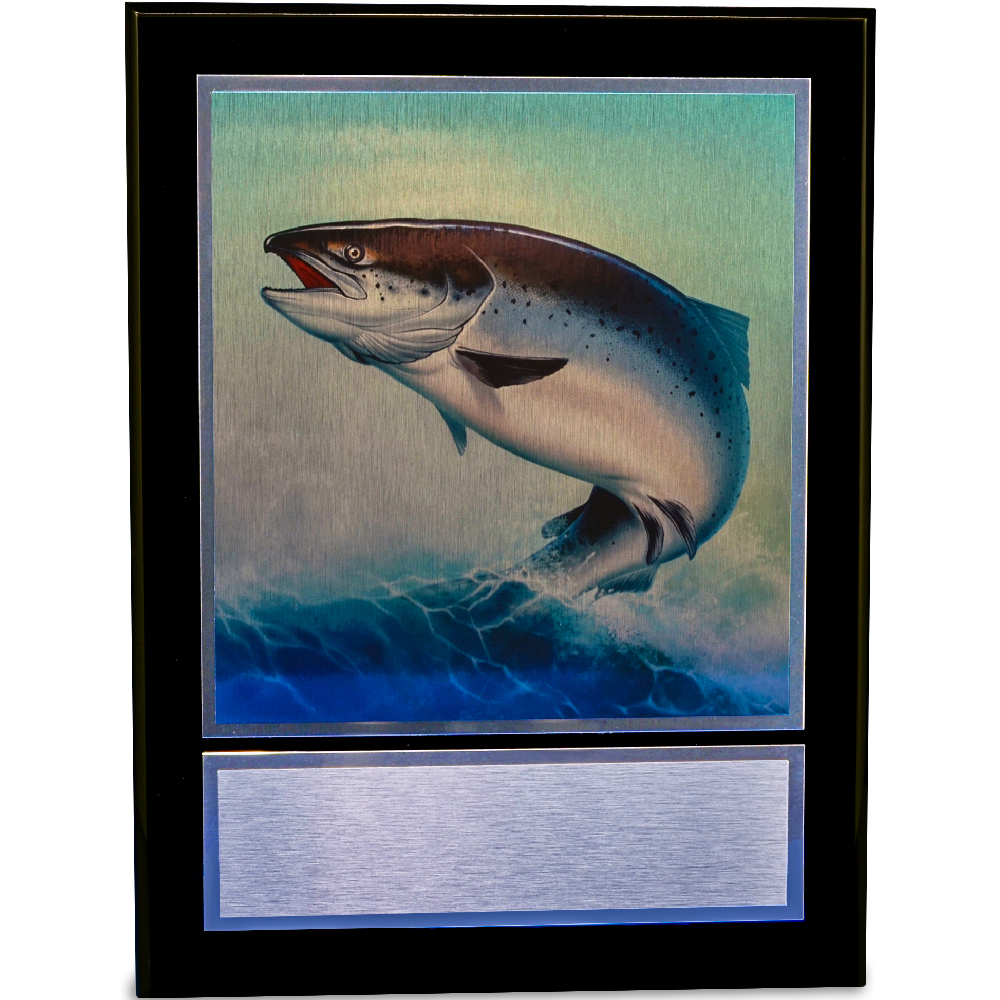 This vibrant Salmon Fishing Plaque features a dynamic full colour image printed on brushed metal, capturing the energy of a bass leaping from the water. Mounted on a black timber backing with a brushed silver engraving plate, its an eye catching and durable award ideal for fishing clubs, tournaments, or personal recognition.