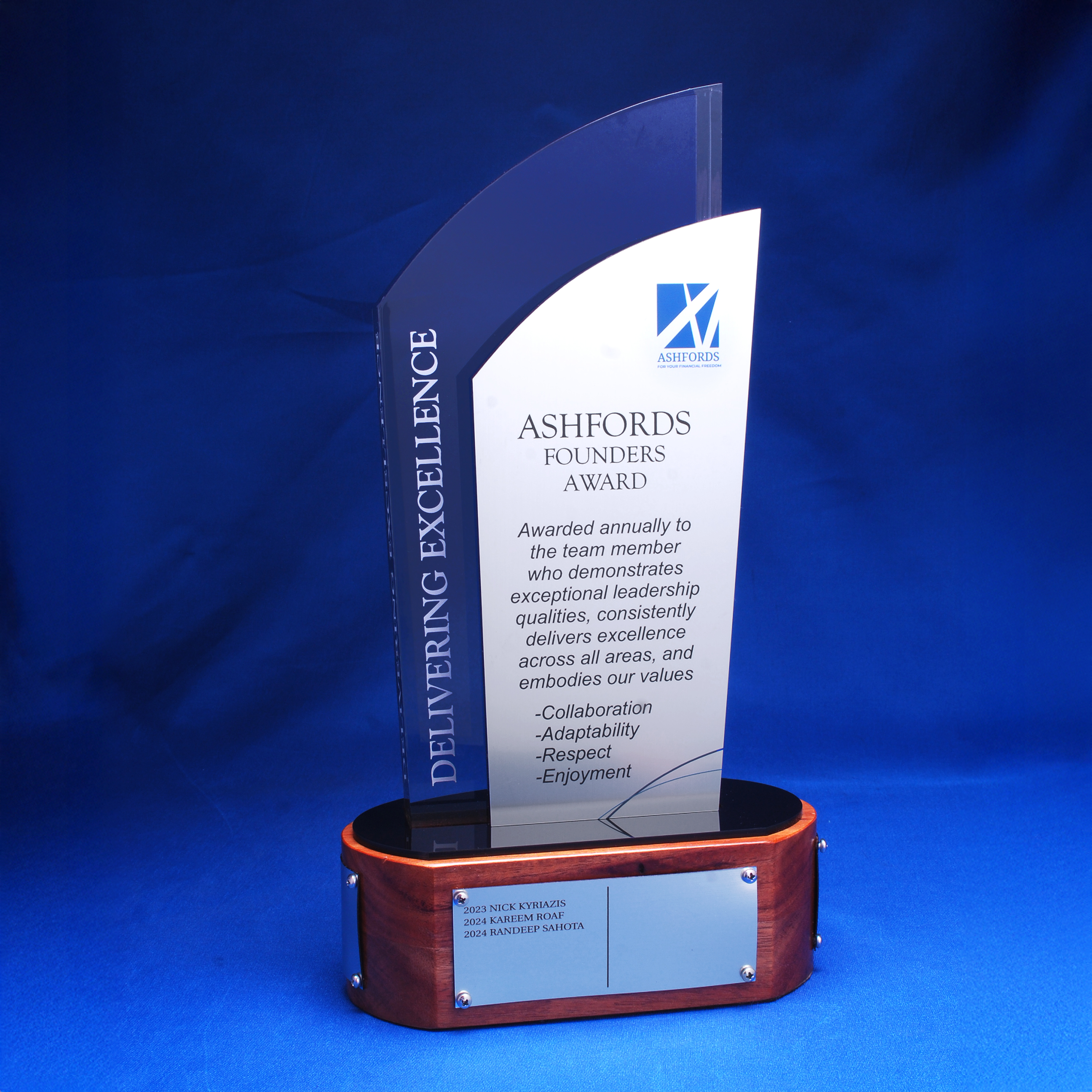 This contemporary perpetual award plaque combines clear acrylic with a refined metalex overlay for a sophisticated and modern look. Designed to honour ongoing achievement, its durable build and elegant finish make it a trusted choice for professional settings and community recognition. The sleek design ensures each milestone is commemorated with style and precision.