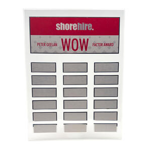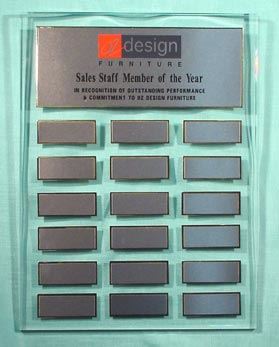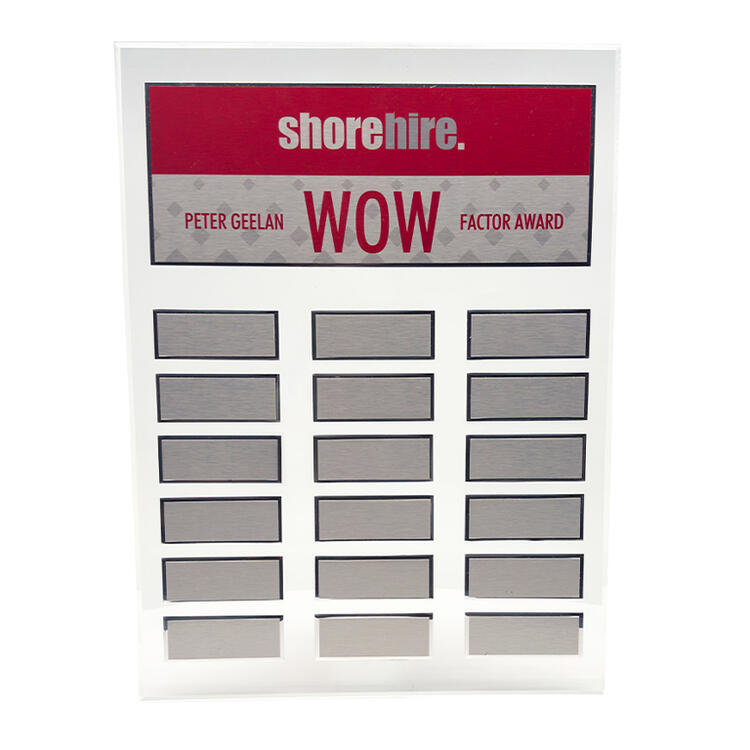 This contemporary perpetual award plaque combines a clear acrylic base with double silver printed plates for a refined, modern look. The transparent finish highlights achievement, while the dual plates offer lasting versatility for ongoing recognition. Ideal as a professional award plaque, this durable design is crafted to mark achievements year after year, making it a trusted choice for memorable perpetual award presentations.