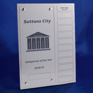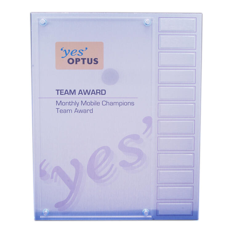 This perpetual award combines a contemporary design with practical functionality, showcasing a single row of plates beneath a polished acrylic overlay. Crafted for ongoing recognition, it provides a reliable and elegant platform for marking achievements across years or events. The acrylic overlay adds a layer of clarity and durability, making it a trusted choice for professional recognition programmes.