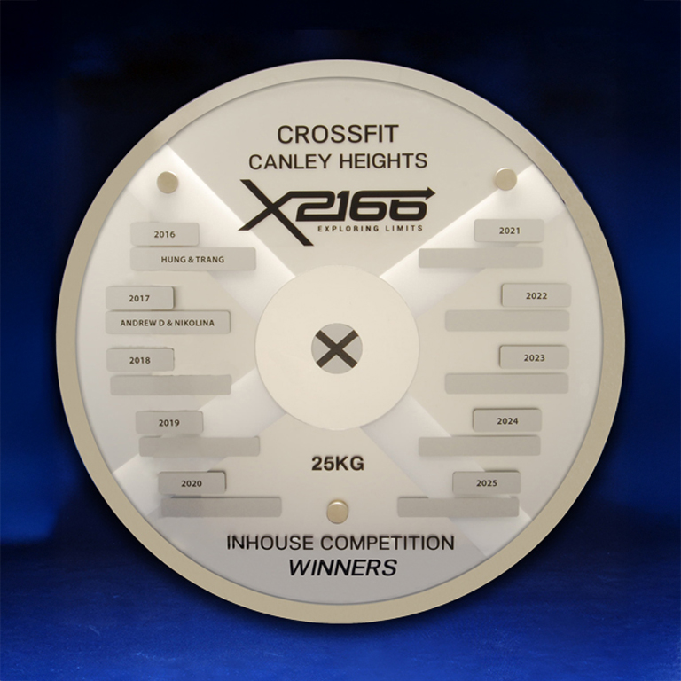 A unique perpetual award designed in a round lumina style to resemble a gym weight plate, perfect for CrossFit and fitness competitions.