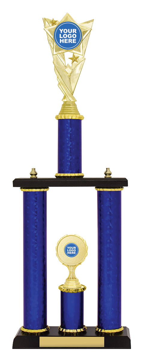 This contemporary trophy features striking gold, blue, and black cylindrical columns crowned by a star shaped top, making it a standout among award trophies for general achievement. Crafted from a blend of durable plastic and timber, it offers a refined presence suitable for a wide range of recognition events. A customisable logo area and sturdy base provide scope for personalisation, ensuring a memorable celebration of accomplishment.