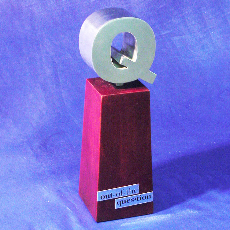 A striking custom award featuring a solid timber base with a polished finish, topped with a precision cut metal Q accent.