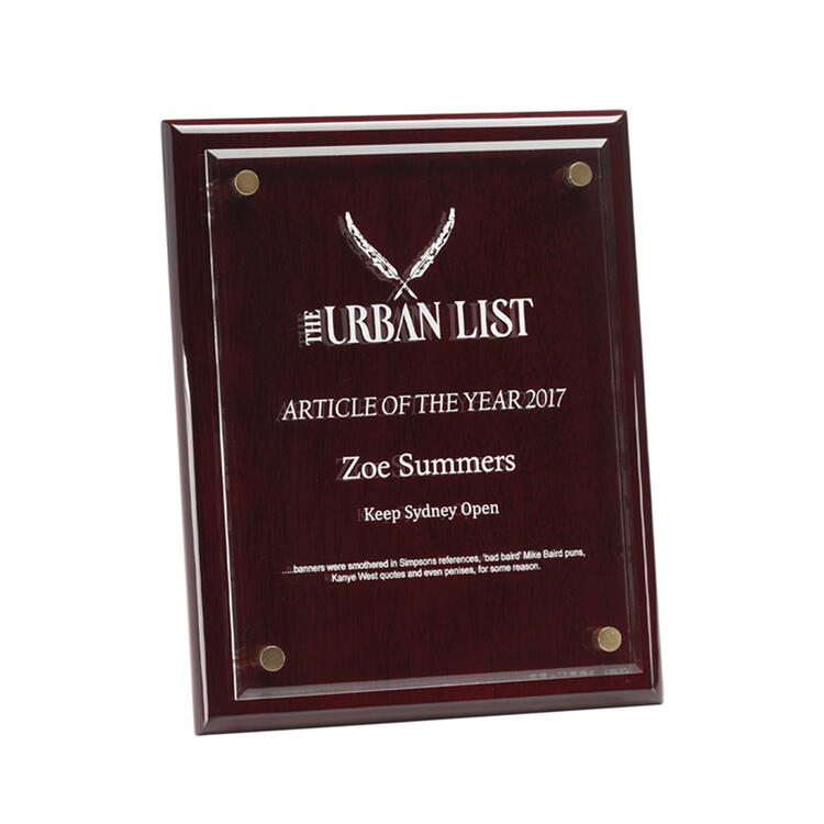 This premium rosewood piano finish plaque with a floating acrylic front is crafted for memorable recognition and professional presentation; a premium high end recognition plaque.