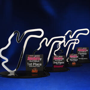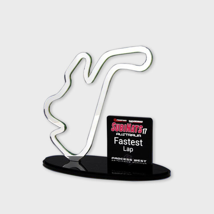 Custom-shaped acrylic race track award featuring a laser-cut racetrack outline mounted on a glossy black base. Printed panel for event branding and winner details. Designed for automotive and racing events.