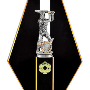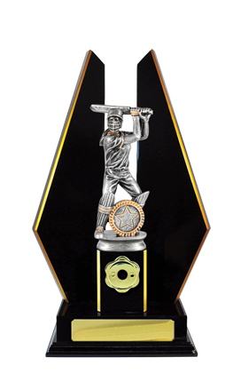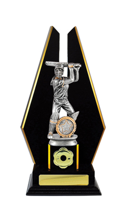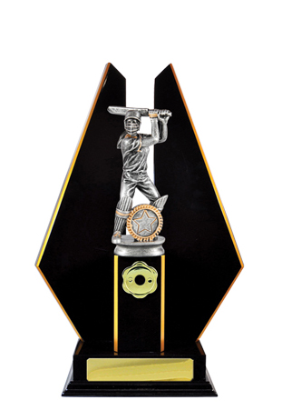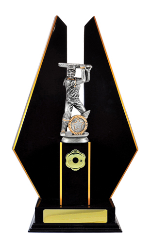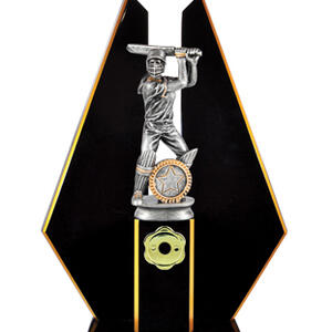 This cricket trophy celebrates excellence in women's cricket with a dynamic female batsman figurine, highlighted by a refined bronze and silver finish. The angular sides and central star backed design convey both movement and achievement.