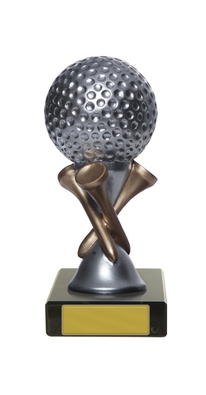 This refined trophy honours golfing achievement with a contemporary design, featuring a golf ball atop crossed clubs in a striking gold and silver finish. Crafted from resin, it stands tall and is set on a stable base, providing a polished presence for any presentation.