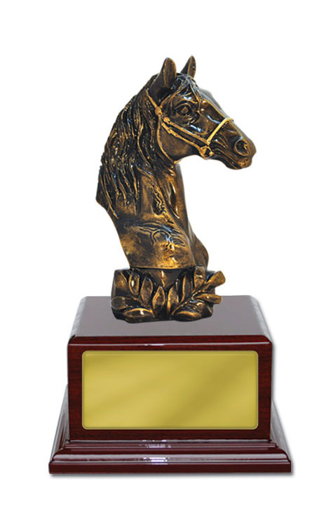 Showcasing a detailed horse head sculpture in gold, this horse show trophy is crafted for those who appreciate excellence in equestrian achievement. The figure stands on a timber base, completing an elegant and durable piece. With its refined presence, this equestrian award is ideal for recognising accomplishment or enhancing any equestrian themed setting.