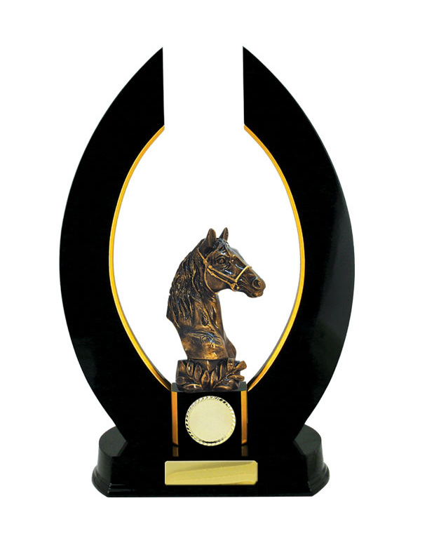 With a bold black timber horseshoe and bronze tone horse head sculpture, this trophy delivers a contemporary, high impact presentation. Ideal for major equestrian achievements, champion rider awards and club recognition. Features a 25mm centre space and gold engraving plate.