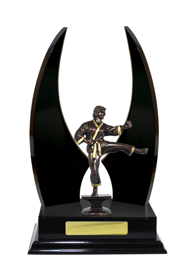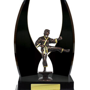 A sleek martial arts trophy showcasing a bronze martial artist on a black high-gloss timber background. Ideal for dojo presentations, club championships or end-of-year awards. Supplied with engraving plate.