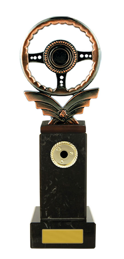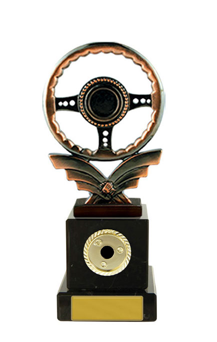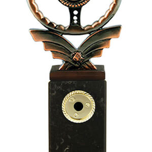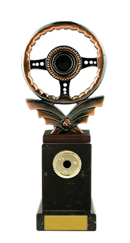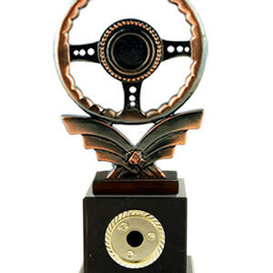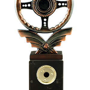 This motor sports trophy stands out with a striking steering wheel design, framed by a classic laurel wreath to symbolise victory. Crafted with a bronze finish and set on a black base, it presents an elegant and durable recognition piece. Perfect for racing trophies, it features a gold engraving plate for personalisation, making it a memorable choice for motorsport achievements.