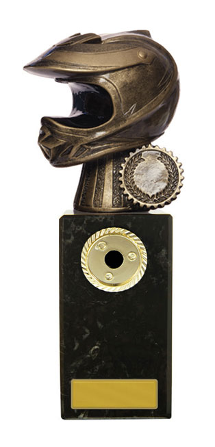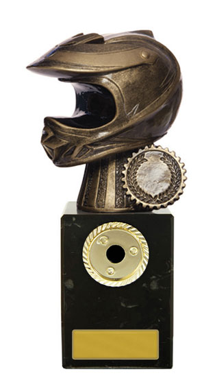 Celebrate motorsport excellence with this helmet shaped motorsport trophy. The detailed helmet design, set against a checkered flag background, stands proudly atop a solid black base. A gold plate allows for personalisation, making it a fitting and memorable symbol of achievement and skill.