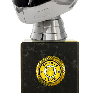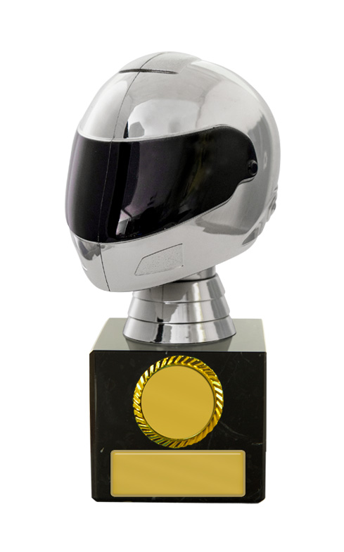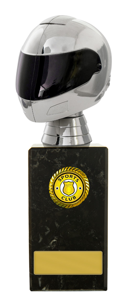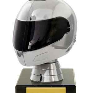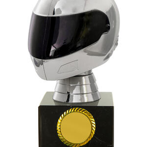 This helmet shaped trophy delivers a classic tribute to motorsport achievement, featuring a detailed helmet design set atop a sleek column and marble base. Crafted in an elegant silver and black finish with gold accents, it creates a distinguished presence for any ceremony.